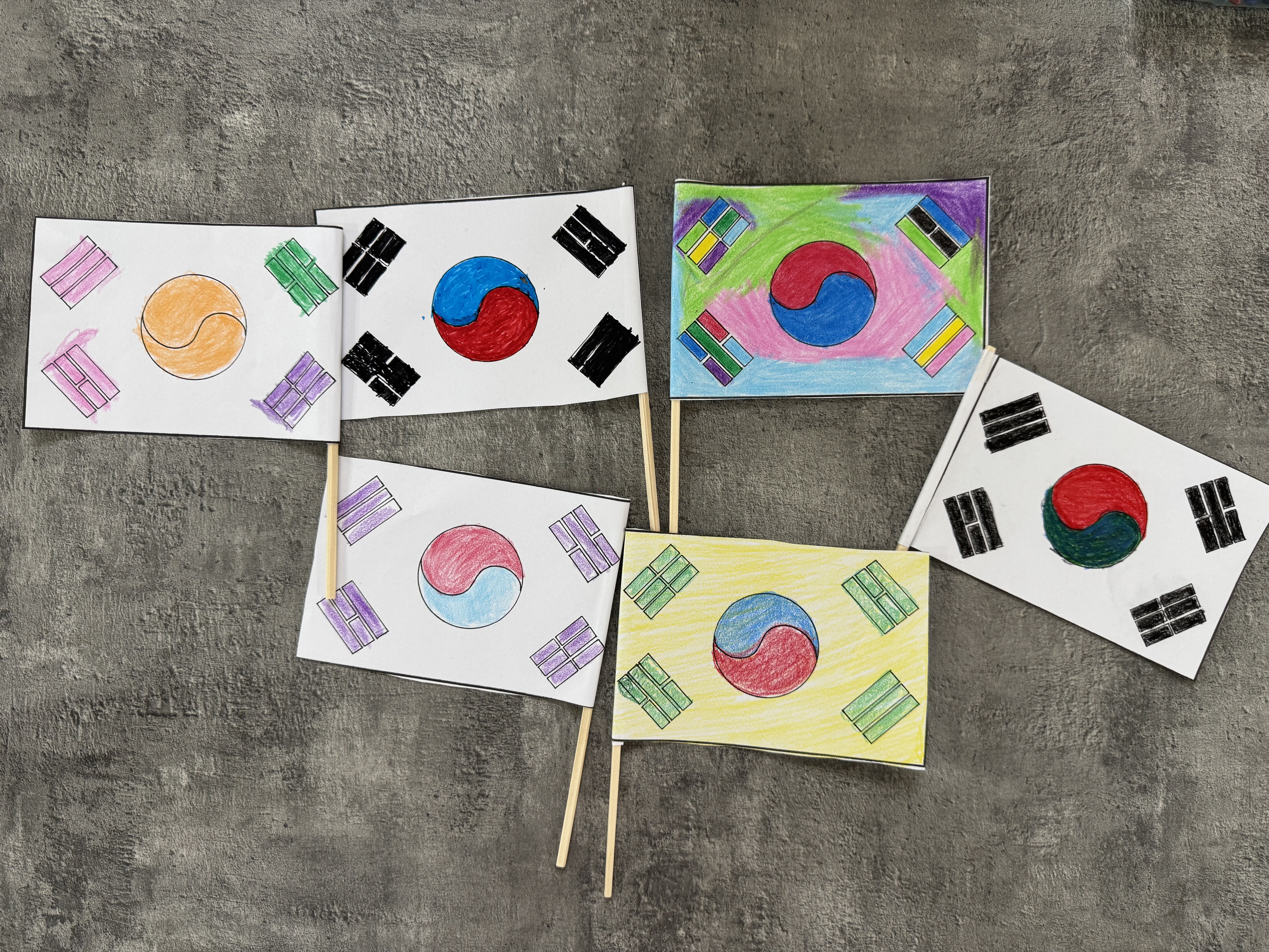 정해진 태극기 색이 아닌 자신이 원하는 알록달록한 색으로 자유롭게 색칠하며 개성을 표현하셨어요!